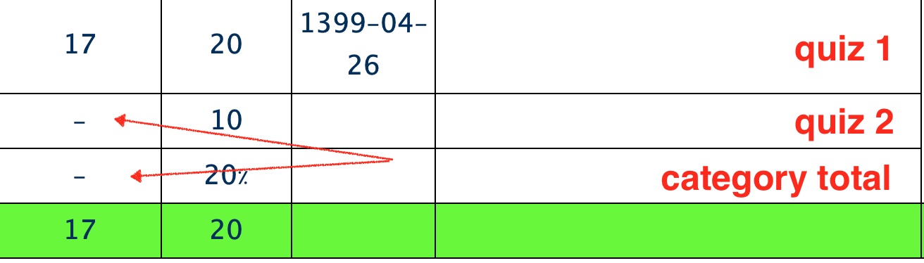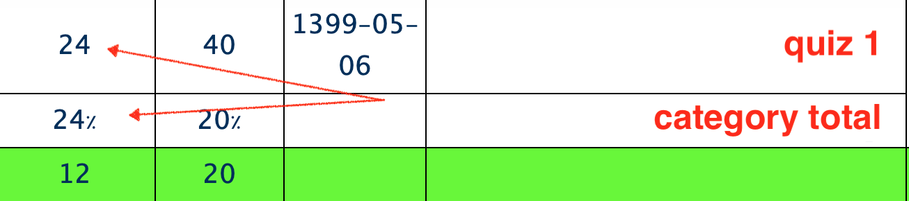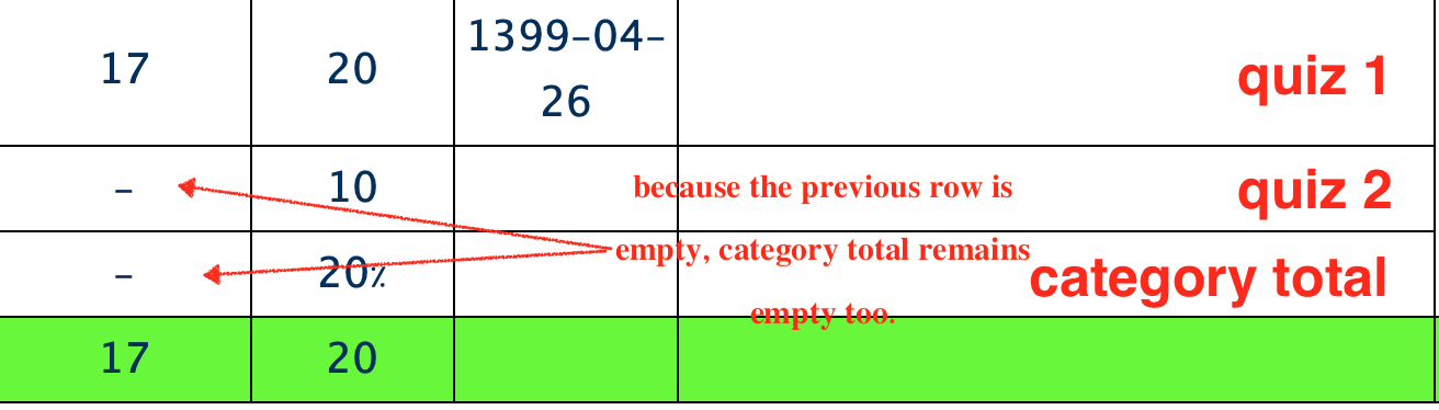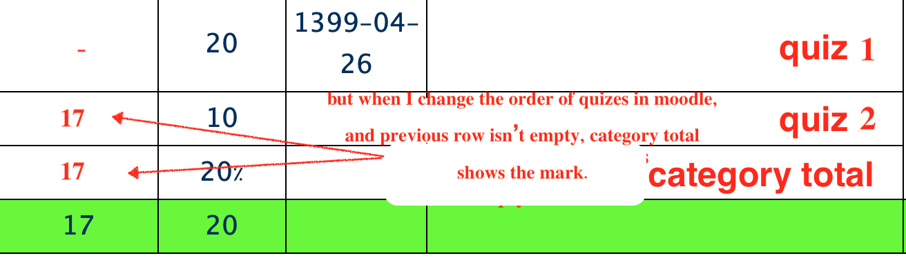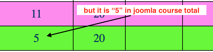 1. in joomla "user grades" the "category total" returns "20" for max mark. but for "user mark" column it doesn't show the average of user's grade in that category. it only repeats the the mark in previous row.