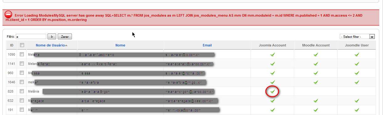 [Tue Jan 18 18:42:04 2011] [error] [client 200.***.167.100] PHP Warning: Invalid argument supplied for foreach() in /home/storage/5/ea/a0/mydomain/public_html/administrator/components/com_joomdle/helpers/content.php on line 627, referer: www.mydomain.com.br/administrator/index....m_joomdle&view=users