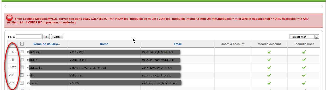 9) The screen loads with the error message from MySQL and brings the list of user IDs and negative. Picture 04.