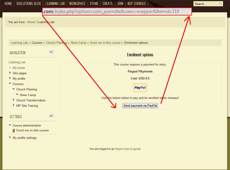 When in “home page” click on a paid course, the course description shows up with the paypal logo and the button at the bottom “Send payment via Paypal”. Click on the button and it just refresh the page.