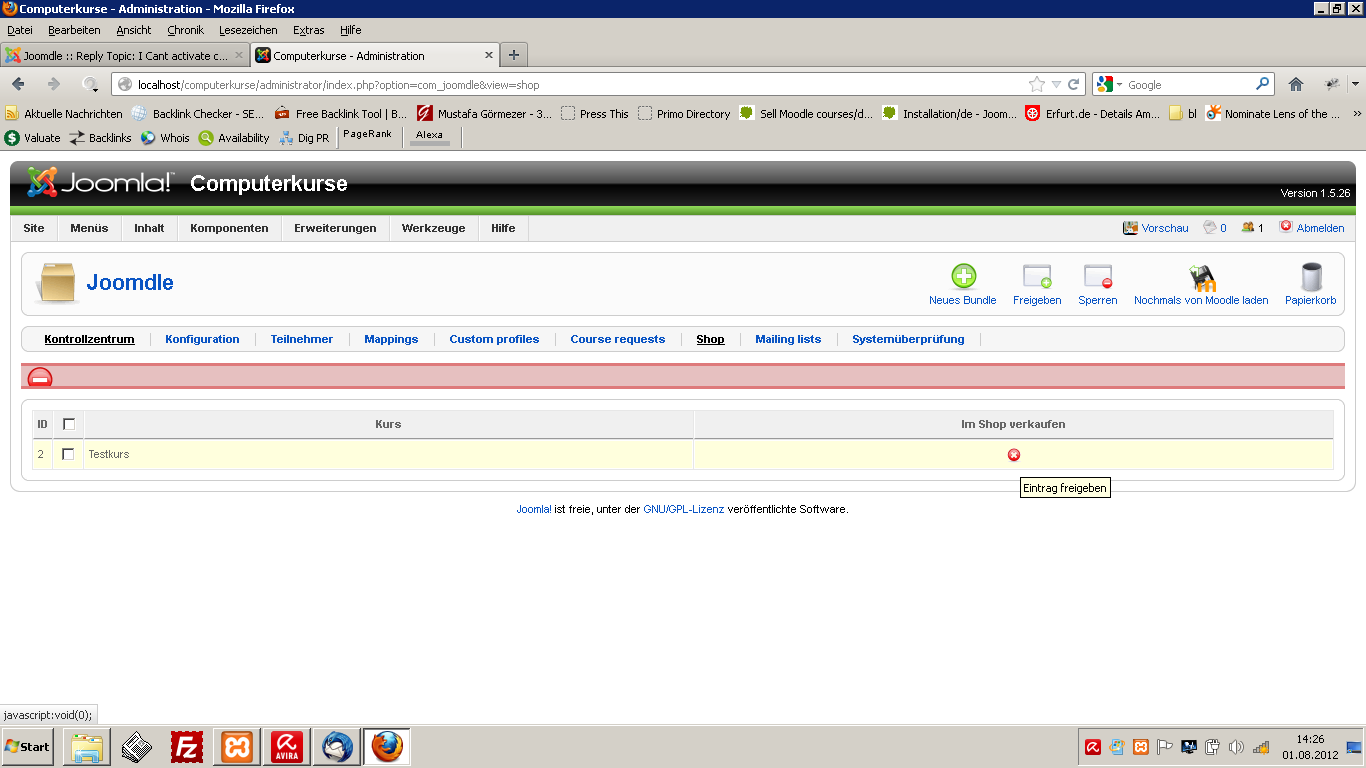 I ve installed virtuemart 2 to bought my curses but if i go to the joomdle administration page to activate the testcurse for the shop i get a failure. But it doesnt show me which failure.
